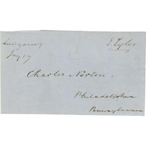 <B>President John Tyler Franking Signature</B></I> on an address panel, 4.75 x 2.75", written entirely in his hand. Free frank is uncancelled and panel does not bear any postal markings; with light soiling, otherwise very good. With a postage stamp commemorating Tyler hinged to an album page.<BR><BR><b>Shipping:</b> Flat Material, Small (<a target="_blank" href="http://www.heritageauctions.com/common/shipping.php">view shipping information</a>)