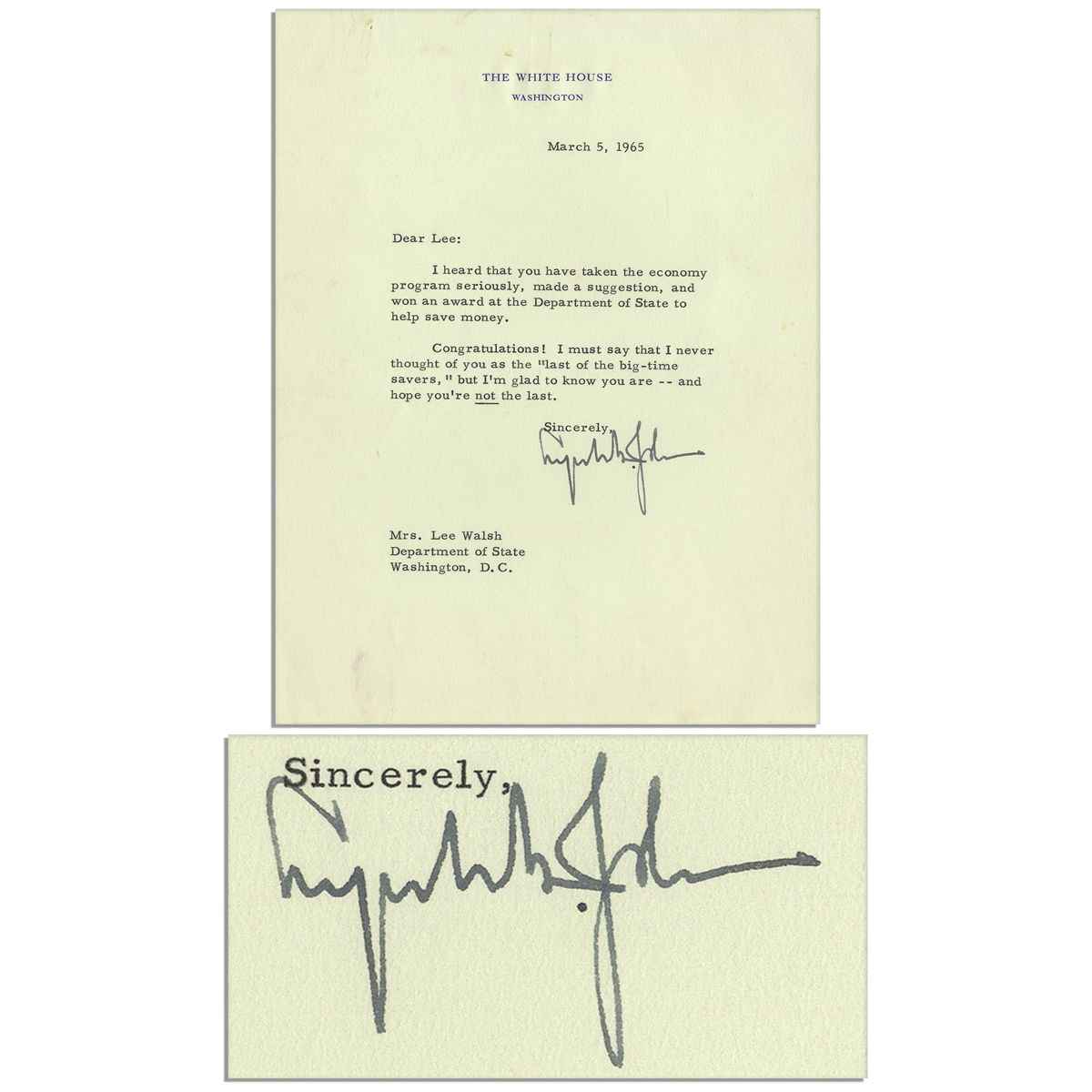 President Lyndon B. Johnson typed letter signed on official White House letterhead, dated 5 May 1965. Letter is addressed to Department of State Deputy Assistant Secretary Mrs. Lee Walsh. Reads in full: ''Dear Lee: I heard that you have taken the economy program seriously, made a suggestion, and won an award at the Department of State to help save money. Congratulations! I must say that I never thought of you as the 'last of the big-time savers,' but I'm glad to know you are -- and hope you're not the last.'' Signed ''Lyndon B. Johnson'' in black ink. Letter on one page measures 6.75''x 8.75''. Shallow horizontal fold, else near fine.