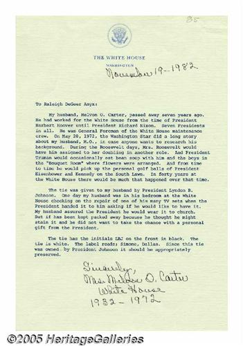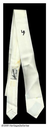 <B>President Lyndon B. Johnson Owned Monogrammed Necktie</B></I> Melvon O. Carter served seven Presidents in the White House from Herbert Hoover through Richard Nixon on the Maintenance Crew. One day Carter was checking on the repair of a television in LBJ's bedroom at the White House when Johnson offered him this narrow white tie, monogrammed, "LBJ," and made by Simones of Dallas. It is accompanied by a detailed historical letter from Carter's widow who recounts the circumstances of the gift, and recounts other humorous anecdotes of her husband with Harry Truman, Dwight Eisenhower and John F. Kennedy. Lot:255