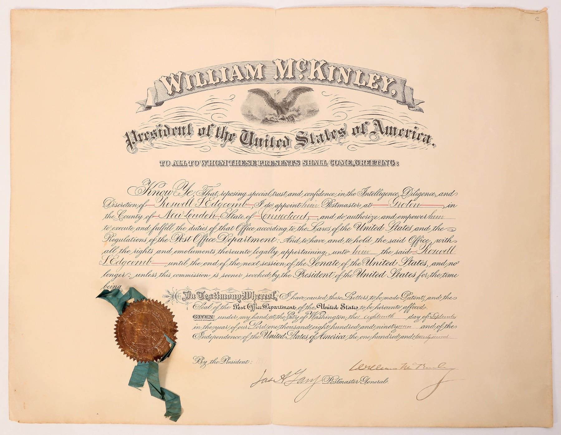 President William McKinley signed postmaster appointment document. Dated September 18, 1897. this 17"x 22" document appoints Rosewell Edgcomb the postmaster of Groton, New London County, Connecticut. There is a gold seal with ribbon still affixed. A very rare document. with a rare signature. This is not secretary signed, it's the real thing.