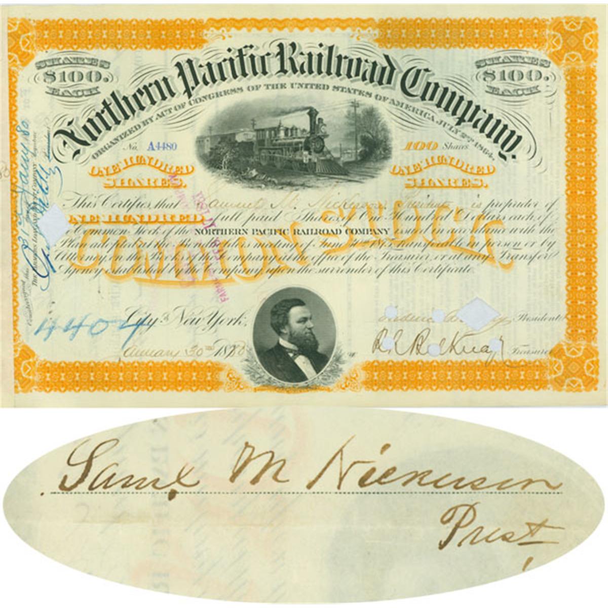 1893, Northern Pacific Railway Stock certificate for 100 shares. Engraved vignette of a steam locomotive at top center, nice portrait vignette of Frederick Billings at bottom issued to and signed by WILLIAM L. BULL: President of the New York Stock Exchange 1888-1890. Authored Lectures on Organized Labor and Capital. Signed on verso: “Wm. L. Bull”. Green/Black. Punch hole cancellations not affecting signature. Mild glue marks to left side attachment to stub. Very Fine.