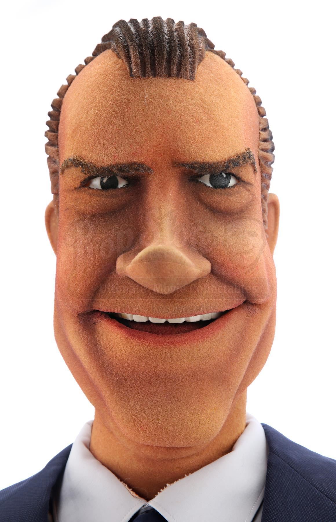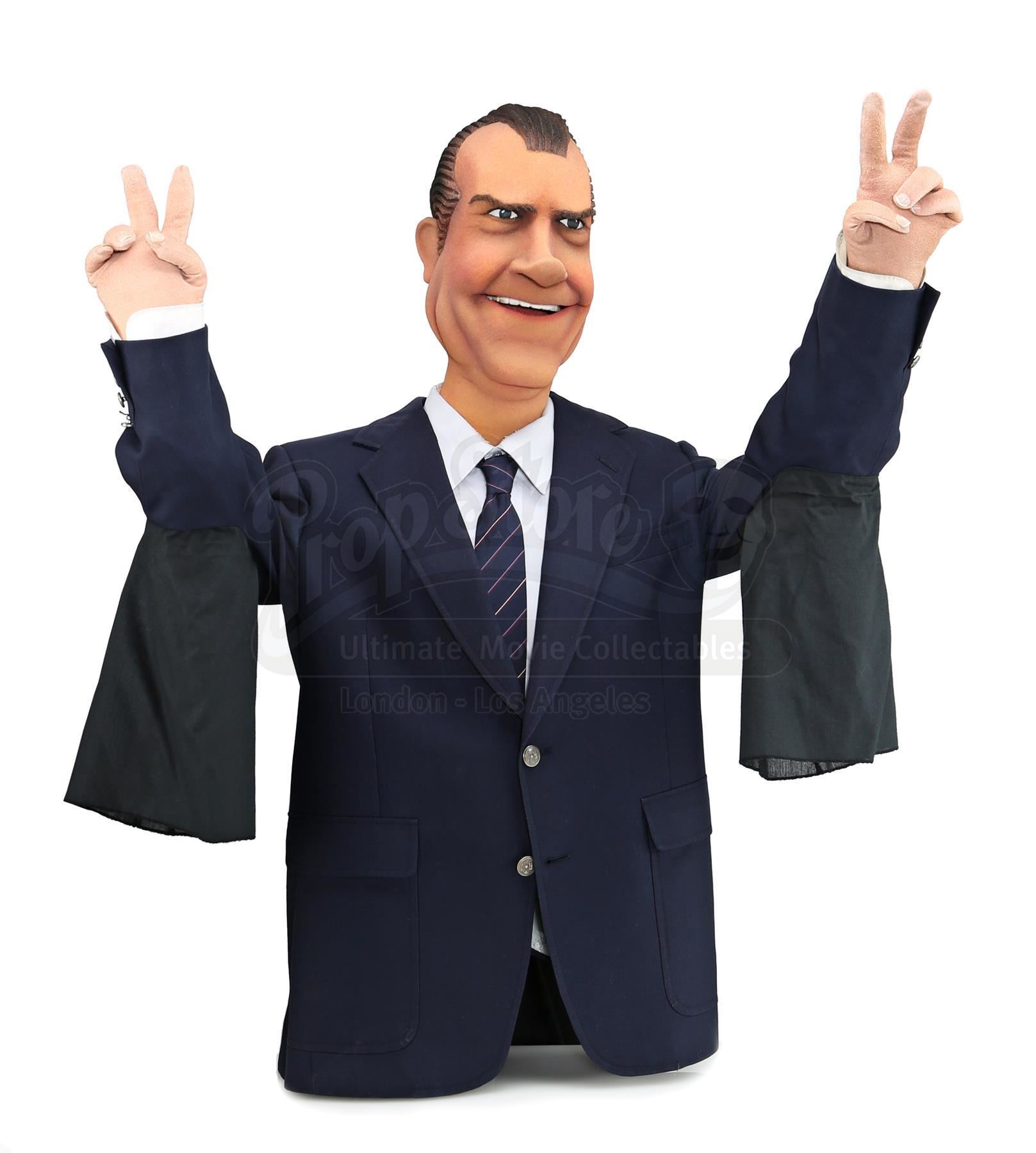 A President Nixon human-sized puppet head and body from Sid and Marty Krofft’s satirical sitcom D.C. Follies. The highly detailed carved foam puppet has beige colored jersey hands and hand-painted urethane fingernails. It is dressed in a navy wool blazer from Hart Schaffner and Marx, a grey blue Tarleton shirt and navy maroon striped tie dressed on an internal armature structure. There are foam arms with black sleeves stitched to each elbow. The jacket pocket is marked ‘abc’ and the shirt is marked ’Ted Kennedy’ on interior. The puppet head is made of reticulated foam that has been sculpted, dyed and airbrushed in Nixon’s caricature image. It features a receding hairline, elongated nose, white teeth, plastic eye inserts and dark brown hair. Two straps, one marked ‘NIXON’, protrude from the neck. The puppet is in good, production-used condition overall.