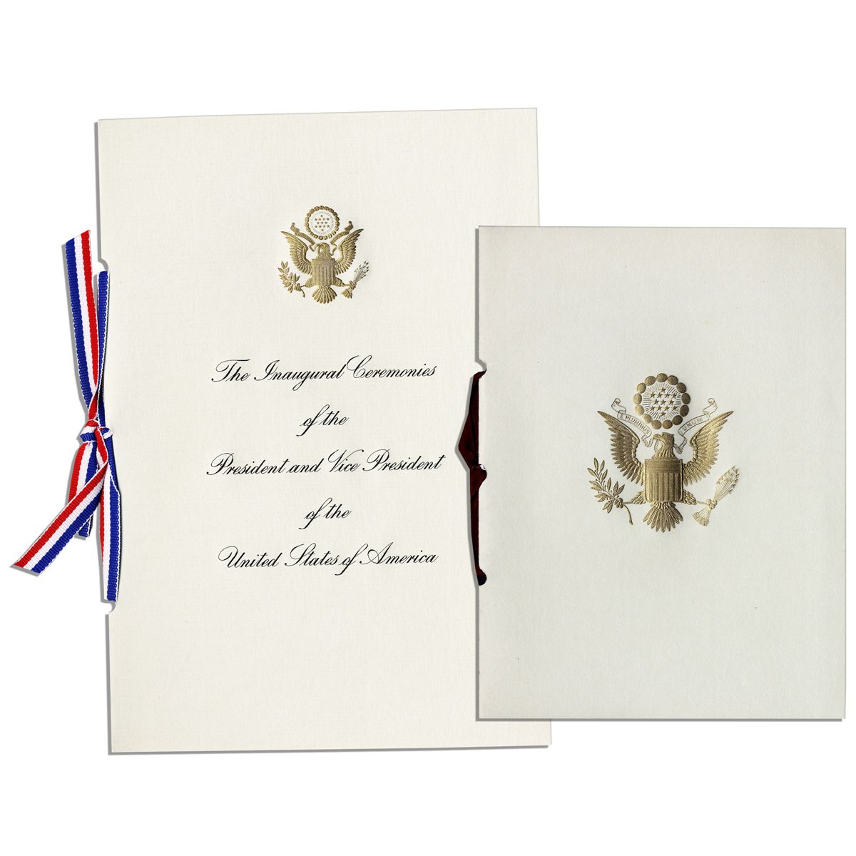 President Ronald Reagan 1985 official Inauguration invitation, addressed to Judge Irving Kaufman and his wife. Includes a collection of inauguration day-related memorabilia, including: (1) Inaugural luncheon menu, dated 21 January 1985, measuring 4.75'' x 7'' with toning in one spot and a crease running vertically; (2) 8 January 1985 postmarked enveloped addressed to the Irvings; (3) Official inaugural luncheon program, measuring 5'' x 6.5''; (4) Two table place cards, measuring 3.75'' x 2.5'' and reading ''Judge Irving'' and ''Mrs. Kaufman''; (5) Ticket admitting Mrs. Kaufman to the luncheon, measuring 3.75'' x 2.75''; (6) Official Inauguration invitation, dated 21 January 1985, measuring 6.25'' x 9.25'' with an official admission card measuring 4.5'' x 2.5''; (7) Inauguration official program of the ceremonies, measuring 6.25'' x 9''; (8) ''Congress of the Unites States / North Box 2'' envelope measuring 10.5'' x 7''. Overall near fine condition.