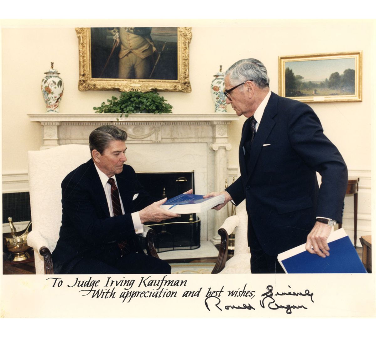 Ronald Reagan signed official White House photo to Federal Judge Irving Kaufman, dated 14 January 1986. Photo depicts Kaufman handing President Reagan a book in one of the White House rooms. With ''To Judge Irving Kaufman / With appreciation and best wishes'' printed along mat and signed by the President: ''Sincerely Ronald Reagan'' in black marker. With an official White House stamp to verso, dating the photo 14 January 1986. Half-matte color photo measures 10'' x 8'' with minor toning, else very good to near fine condition.