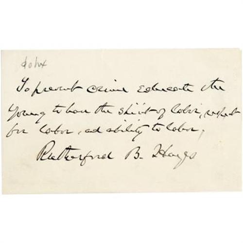 <B>President Rutherford B. Hayes Autograph Manuscript Signed</B></I> 4.5” x 2.75”, n.d., n.p.. “To prevent crime educate the young to have the spirit of labor, respect labor, and ability to labor. Rutherford B. Hayes”. Very slight original smudging, else fine. <I>From the collection of Henry E. Luhrs.</B></I><BR><BR><b>Shipping:</b> Flat Material, Small (<a target="_blank" href="http://www.heritageauctions.com/common/shipping.php">view shipping information</a>)