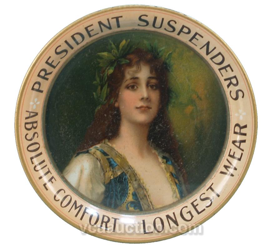 President Suspenders Tin Tip Tray, "Absolute Comfort - Longest Wear" in excellent condition - 4" diam