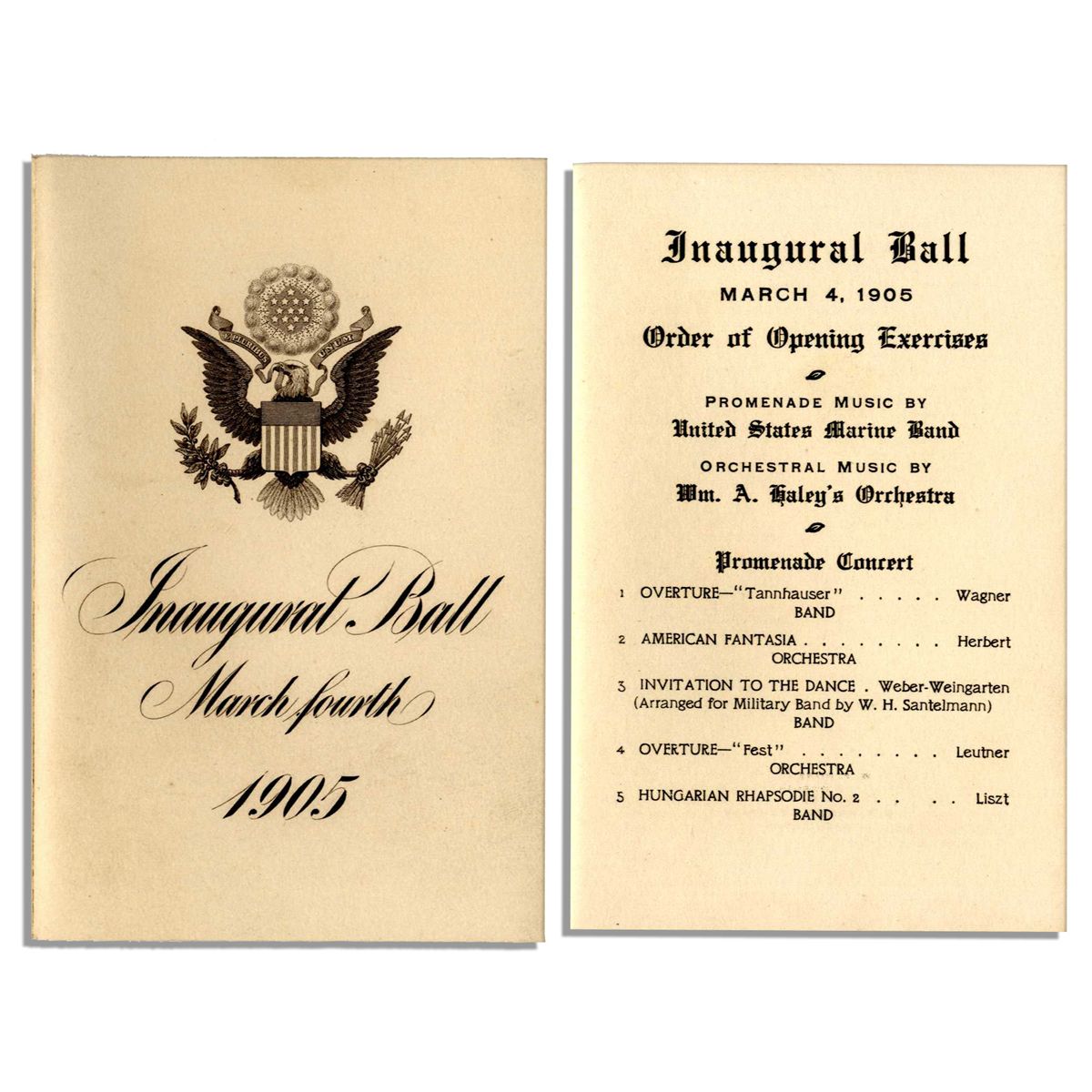 Theodore Roosevelt's 1905 official Inaugural Ball program commemorating his first full term as President. Printed by the W.F. Roberts Company in Washington D.C., program depicts the engraved seal of the President to front cover with ''Inaugural Ball / March Fourth / 1905'' in elegant script. Back cover has ''1905'' engraved. Interior pages list the ''order of opening exercises,'' Inaugural Committee members, and the lavish ''supper'' menu. Card-style program measures 3'' x 4.75'' and runs 8pp., front and verso. Program cover has a 3'' split along binding, though still intact. Minor toning, very good condition overall.