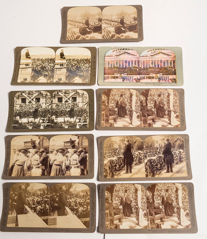 Lot of 9 with only one duplicate view. 1) Six by Underwood & Underwood, c.1903: Roosevelt in Santa Fe; speaking in Lincoln, Nebraska; speaking at Olympia, Washington; rare card of him speaking on "Irrigation and Public Schools to wide-awake audience in Wallula, Washington": and two copies of him speaking at a commencement at Univ. of California, Berkeley. 2) Two different of Roosevelt on his Western Speaking Tour by American Stereoscopic Co., c.1903: Roosevelt speaking at the entrance to Yellowstone; and a speech at Quincy, Illinois. 3) One color card c.1905 by Ingersoll of Roosevelt taking the oath of office at the inauguration. Poorest condition of the group. Interesting set in good condition. (Prag Collection) Date: Location: United States HWAC # 54711