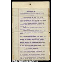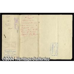 President Theodore Roosevelt Signed Authorization for Replacement of a Lost Cherokee Nation Payment WarrantThis folder, containing the written record of the replacement of a payment warrant in the amount of $200.00 originally issued on December 7, 1896 to the firm of Marcus & Fears, contains the text of the necessary United States Senate legislation authorizing replacement of the lost warrant, signed by Clerk of the Senate Edw. Washburne and ratified on December 5, 1902 by Principal Chief of the Cherokee Nation T.M. Buffington, as well as Assistant Executive Secretary of the Cherokee Nation A.B. Cunningham. Also included is a notarized affidavit signed in the Northern District, Indian Territory on December 1, 1902 in support of the issuance of a replacement warrant as well as the signed statement of U.S. Indian Agent J. Blair Shoenfelt certifying that the warrant had never been paid as well as the signed approval dated White House, Washington, February 21, 1903 in the hand of T. Roosevelt.The T. Roosevelt signed attachment is reinforced at a lateral separation by and is an ideal candidate for professional conservation. <BR><BR><B>Important notice:</B> Heritage usually auctions material at the rate of 200-250 lots per hour. On some occasions eBay Live bid software or the Internet may not be able to keep up with the pace of the auction. We recommend placing a realistic absentee bid now as insurance to avoid disappointment. Occasionally the auctioneer may eliminate or reject an eBay Live bid, and the auctioneer may also reopen a lot after the close of the eBay live bidding (usually because we missed an audience bid), and may reject your bid even if it shows you as the winning bidder. By bidding via eBay Live, you agree that Heritage may award the lot to another bidder at its sole discretion under the circumstances described above or any other reasonable circumstances. Since eBay bids are not shown to us until we open the lot on the floor, we treat those bids just like floor bids. In most cases the floor responds before the eBay bid is presented to us, due to Internet lag time, so for consistency we have made it a policy that floor bids are always considered first over tie eBay live bids. Also please note that all Heritage lots purchased through eBay Live carry a 20% Buyer's Premium. Please make sure you read the Terms and Conditions before you bid. <BR><BR><B>IMPORTANT ANNOUNCEMENT ABOUT RESERVES:</B> Heritage now divulges all reserves on its web site 7 days before every auction. If you want to know whether the reserve on this lot has been met, and if not, what the reserve amount is, please visit this lot page on the HeritageCoin.com web site, or email: bid@HeritageGalleries.com