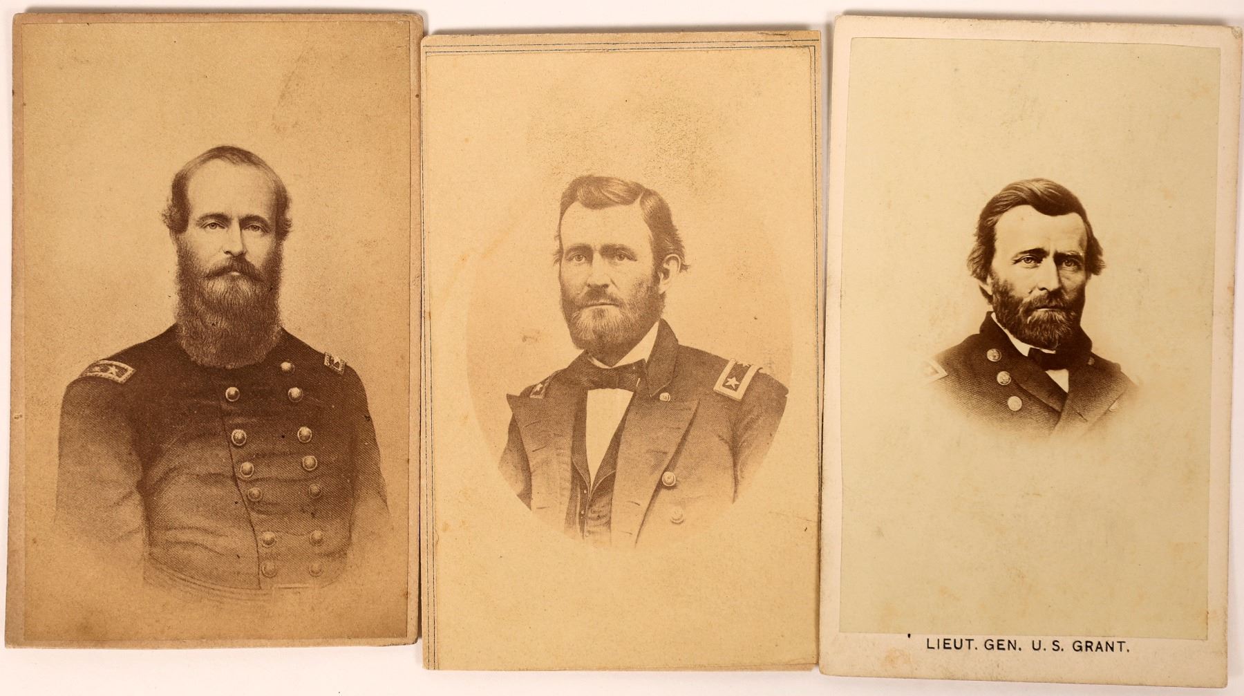 Lot of 3 different photographs. One is labelled Lieut. Gen. U.S. Grant. The other two are identified in pencil on the reverse. No photographer listed on any of them. 2.5 x 3.75" Some soiling. Ulysses S. Grant was the 18th president (1869-1877), and was a distinguished military officer in the Civil War for the Union forces.