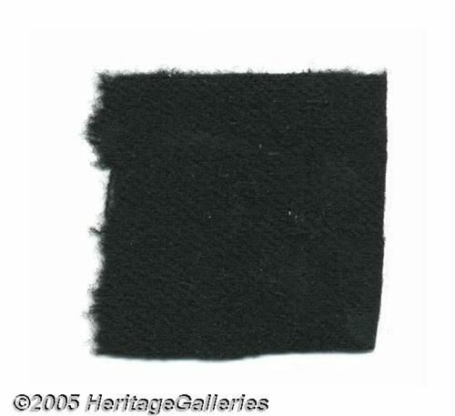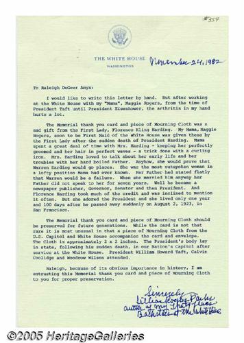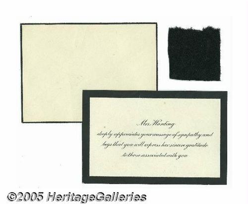 <B>President Warren G. Harding Mourning Cloth and Mourning Card</B></I> Maggie Rogers served as the First Maid of the White House during her career there which spanned from Presidents William Howard Taft through Franklin Roosevelt. First Lady Florence Harding became very close to Rogers following an illness in 1922, at which time Rogers cared for her. The sudden death of President Harding in 1923 wore heavily on the First Lady, who lived only a little over a year following her husband's death. This approximately 2" square piece of black cloth was used in the U.S. Capitol while the President laid in state. The cloth and a First Lady engraved mourning card and envelope are accompanied by a long historical letter, which includes anecdotes about the Hardings on White House stationery which is signed by Rogers' daughter, Lillian Rogers Parks, who also served as a White House maid for thirty years. Lot:254