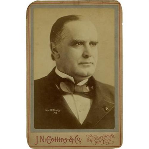 <B>President William McKinley Cabinet Card.</B></I> 4.25” x 6.5”, with J. N. Collins & Company, New York studio mark on the lower photo mount, toned around the edges with the usual bumps to corners, small stain on the verso, else very good. <BR><BR><b>Shipping:</b> Flat Material, Small (<a target="_blank" href="http://www.heritageauctions.com/common/shipping.php">view shipping information</a>)