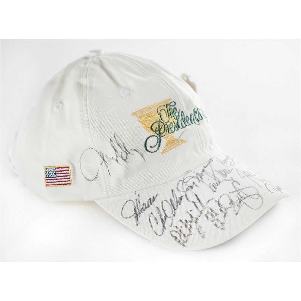 Very desirable off-white The President's Cup cap with buckle adjustment, signed on the brim and crown in black felt tip by the entire United States team from the 2003 Presidents Cup, which includes: Tiger Woods, Jack Nicklaus, Phil Mickelson, Justin Leonard, Davis Love III, Jim Furyk, David Toms, Kenny Perry, Chris DiMarco, Jerry Kelly, Charles Howell III, Fred Funk, Jeff Sluman, and Jay Haas. In fine condition.