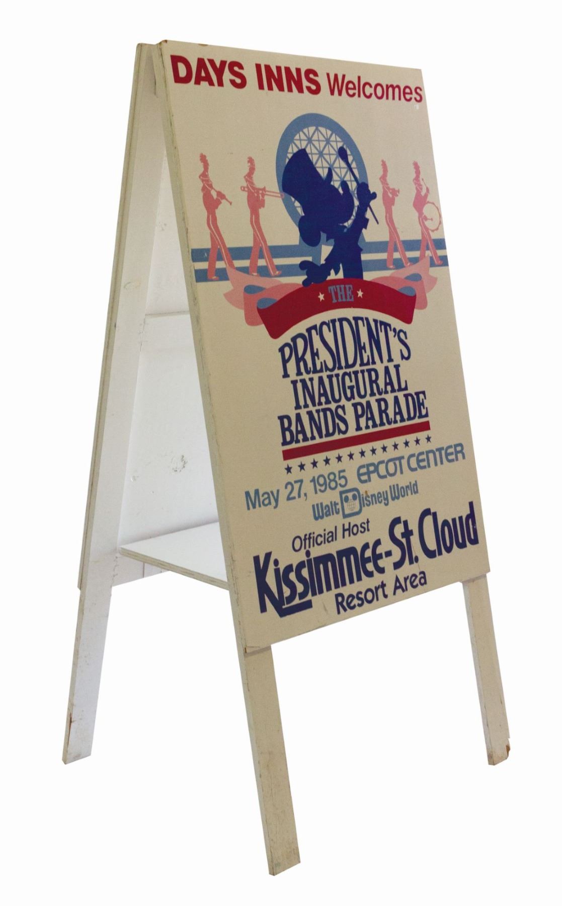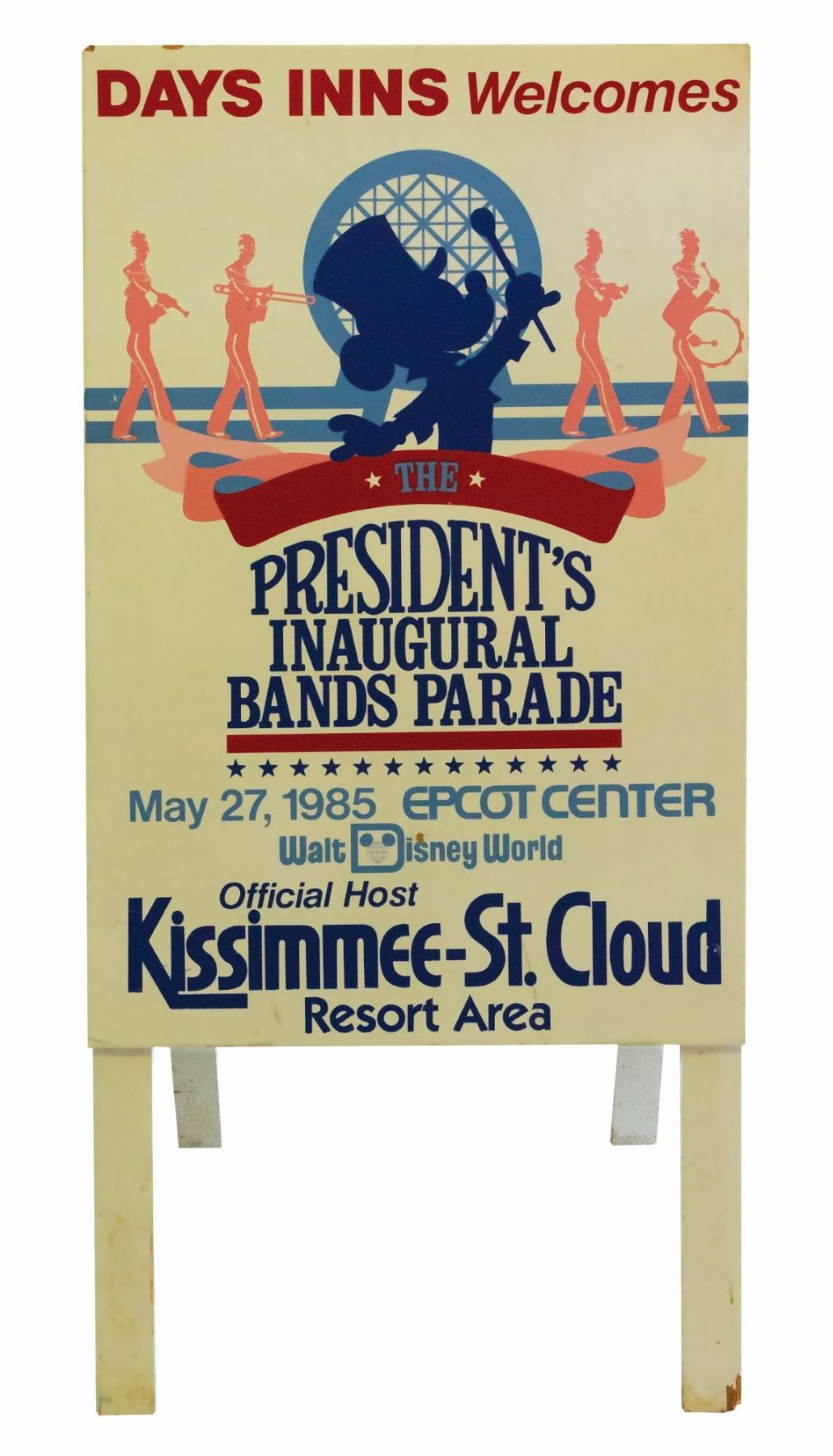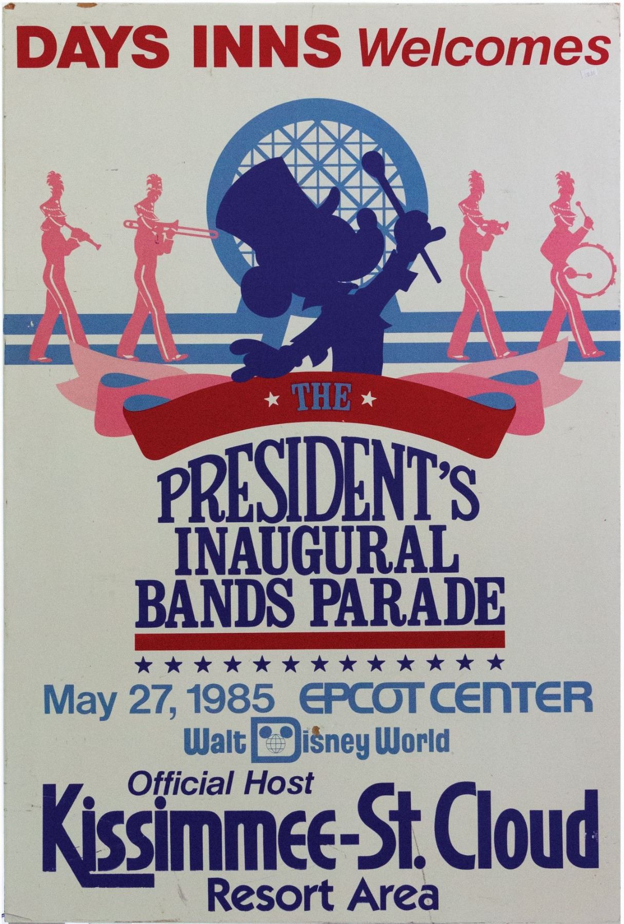 (Epcot, 1985) An original silkscreened folding sign from The President's Inaugural Bands Parade at Epcot Center. Following President Ronald Reagan's victory over Walter Mondale, an inaugural parade was planned for January of 1985, however, poor weather conditions led to the cancelation of the parade. Disney proposed having the parade at Epcot where weather conditions would be better, and the inaugural parade was rescheduled to May 27, 1985. This sign features great imagery of Band Leader Mickey Mouse in front of Epcot's World Showcase, and stands approximately 64" tall. The condition is good overall with surface and edge wear from use and age including a nick near the word Disney.