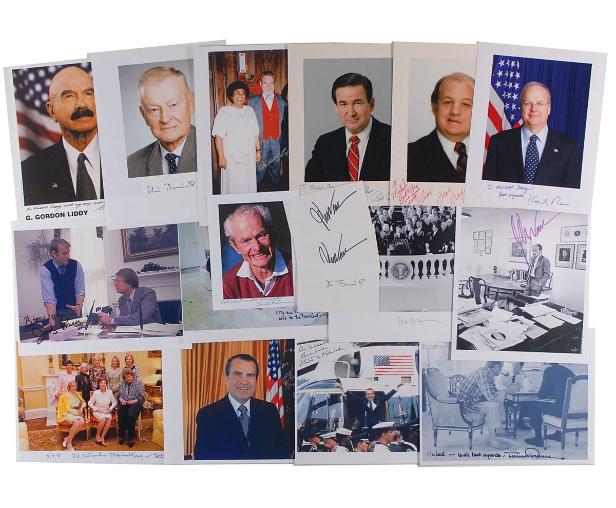 Collection of 19 signed photos and signatures, each signed by a former advisor to the president, with almost all of the photos inscribed. Signers are: Karl Rove, James Brady, Pat Buchanan, C. Everett Koop, Peter Robinson, Zbigniew Brzezinski (SP and signature), Jody Powell, Terrence O’Donnell (SP and ANS), Charles W. Robinson, G. Gordon Liddy, John W. Dean (SP and 2 signatures), Herbert Kalmbach (2 SP), Letitia Baldrige, and Ted Sorensen.