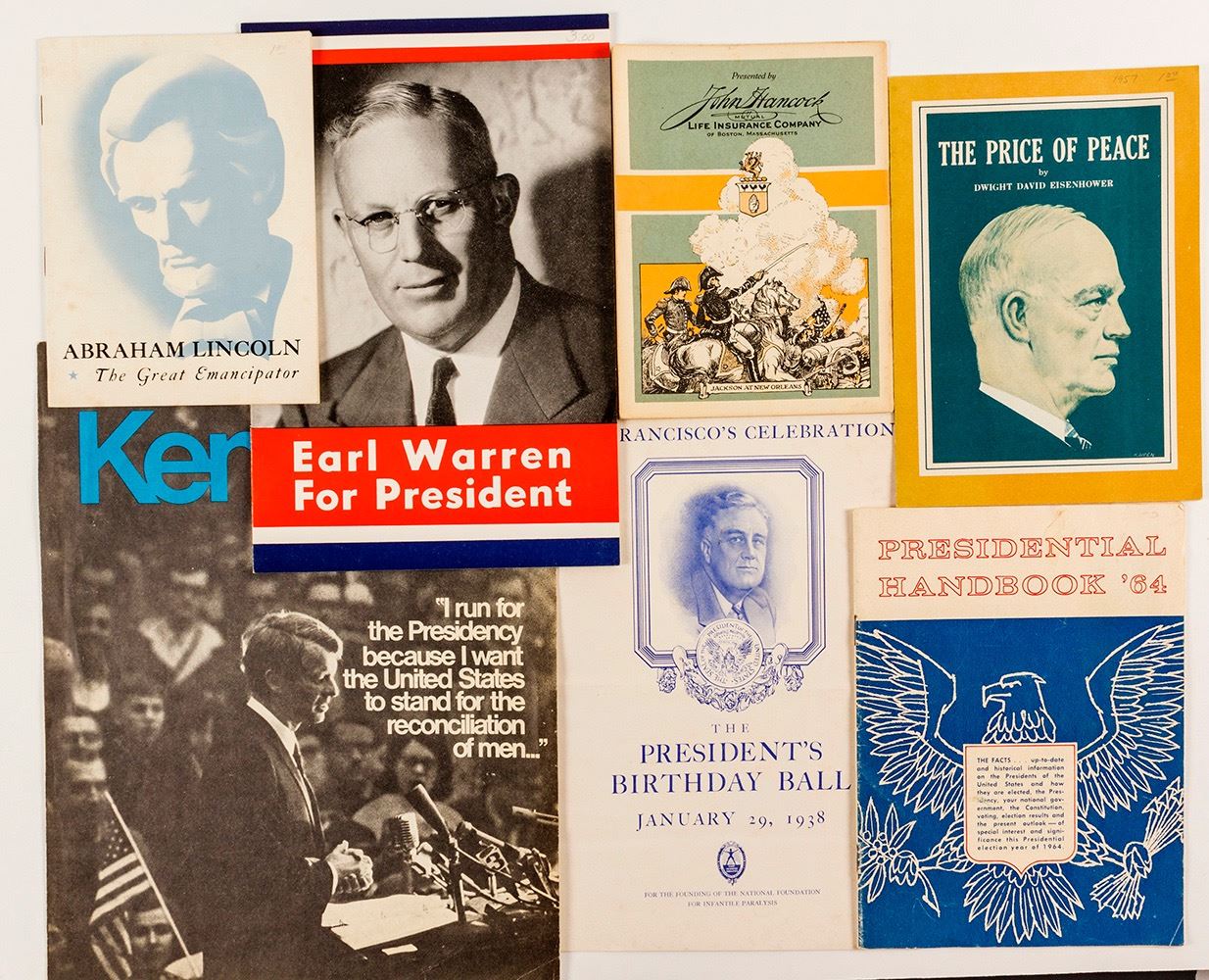 Lot of seven. 1) San Francisco's celebration of the President's Birthday Ball on January 29, 1938. eight pages. 2) Abraham Lincoln, The Great Emancipator. Presented by John Hancock Insurance. 3) John F. Kennedy "I run for the Presidency because I want the Untied States to stand of the reconciliation of men" booklet. Four pages. 4) Presidential Handbook 1964. 24 pages. 5) "The Price of Peace" BY Eisenhower. 12 pages. 6) Andrew Jackson, President of the Plain People. 7) Earl Warren for President. 12 pages. Date: Location: HWAC # 55011
