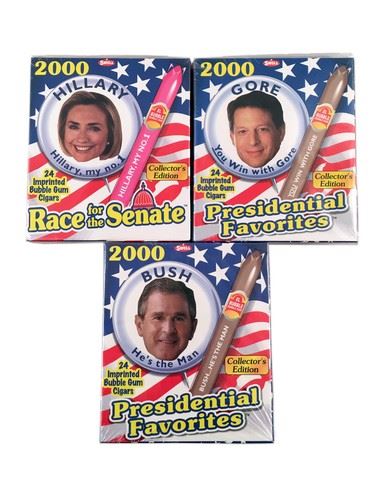Presidential Bubble Gum Cigars Lot of three unopened boxes: Hillary Clinton, George W. Bush & Al Gore. (approx. 6 1/2" x 5 1/2")