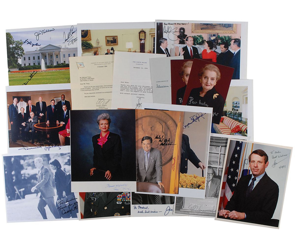Collection of 17 items, consisting of 15 signed photos and two letters, each signed by a former cabinet member or diplomat. Photos are signed by: Condoleeza Rice (ins); William Cohen (ins); Hazel O’Leary; Madeline Albright; Bill Richardson (ins); Carla Hills and Canadian Prime Minister Brian Mulroney; Lawrence Eagleburger (2); Dick Thornburgh; Samuel Skinner (ins); Edward Derwinski; Colin Powell; Jack Kemp (ins); Jim Baker; and one photo signed by Donald Evans, Spencer Abraham, Alberto Gonzales, Jim Nicholson, Christine Todd Whitman, and Anthony Principi. Letters are signed by Colin Powell and Samuel Skinner. In fine condition.