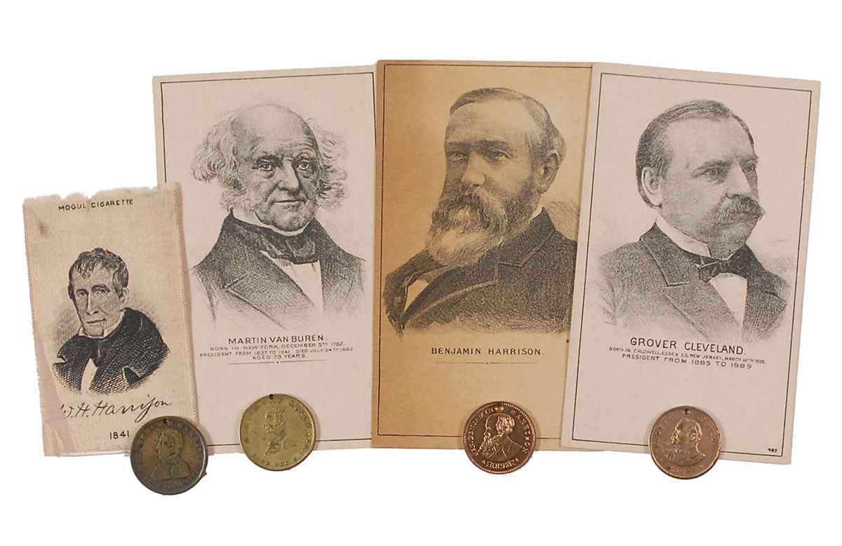 Collection of four original campaign tokens, each measuring just under an inch in diameter, for the presidential campaigns of William Henry Harrison (1840), Martin Van Buren (1840), Grover Cleveland (1888), and Benjamin Harrison (1892). The tokens feature bust portraits of the candidates on one side, and their party or a campaign slogan on the other; they also have holes drilled through top, enabling a person to wear them in support of their favorite candidate. General wear and aforementioned drill holes, otherwise overall fine condition. Accompanied by later commemorative items, including a Mogul Cigarettes silk ribbon of William Henry Harrison and three small cards with engravings of the other three presidents.