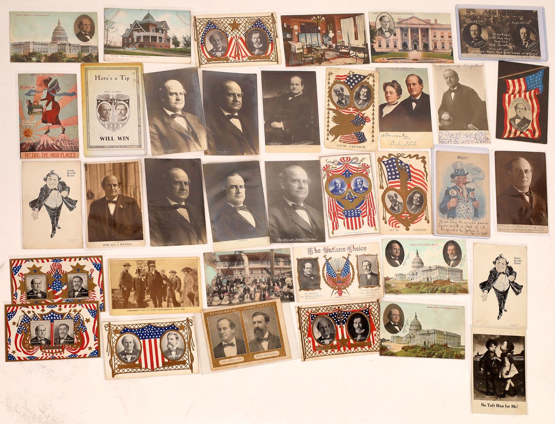 Lot of 36 RPCs and litho postcards, mostly of presidential candidate William Jennings Bryan who lost to Taft in 1908, from the U.S., c1906-1915. Seventeen are canceled with stamps, the rest blank or with some writing. Some feature Bryan's running mate, John W. Kern. Some have the then current president, Teddy Roosevelt.