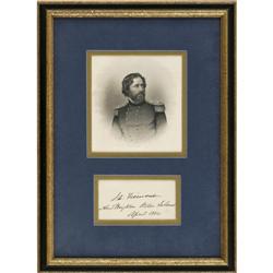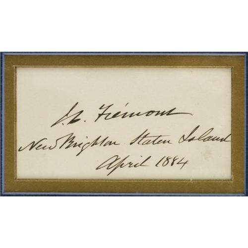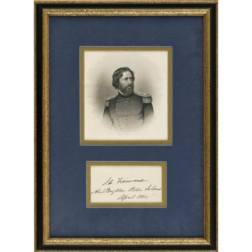 <B>First Republican Presidential Candidate John C. Frémont Autograph</B></I> signed "<I>J. C. Frémont New Brighton Staten Island April 1884</B></I>" on a 4.25" x 2.25" sheet. Frémont is known for several accomplishments. He led multiple surveying expeditions through the western territory of the United States in the 1830s and 1840s and then participated in the capture of California from Mexico during the Mexican-American War. A bit later, gold was discovered on his California estate and he became a multi-millionaire. In 1850, Frémont was elected to the U.S. Senate from California as a Democrat. He was a firm opponent of slavery and became one of the founders of the Republican Party, running for president in 1856 but losing to Buchanan. He served then as a Union officer in the Civil War, and then retiring from public life, he devoted himself to railroad projects in the West, losing much of his fortune in those pursuits. After serving as governor of the Arizona Territory, he moved to New York where he died in 1890. This bold and dark signature is double matted with a period engraving and framed to an overall size of 11" x 15".