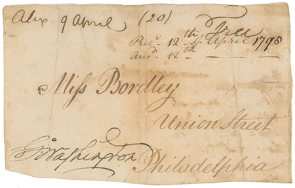 Free-franked address panel, 4.5 x 3, addressed in another hand to “Miss Bordley, Union Street, Philadelphia,” dated “April 9,” in the upper left, “1798,” and marked “Free,” in the upper right corner and franked in the lower left (all in an unknown hand), “Go: Washington.” Panel is accompanied by an unsigned period letter of provenance which reads, “This letter was franked for Miss Eleanor P. Custis Mrs. Washington’s granddaughter—who afterwards married Laurence Lewis Esq. of Virginia, nephew of General Washington—who lived and died on the Estate part of Mount Vernon devised to him by his uncle.” In very good condition, with several light vertical folds, one through a single letter of signature, and scattered light soiling and staining.