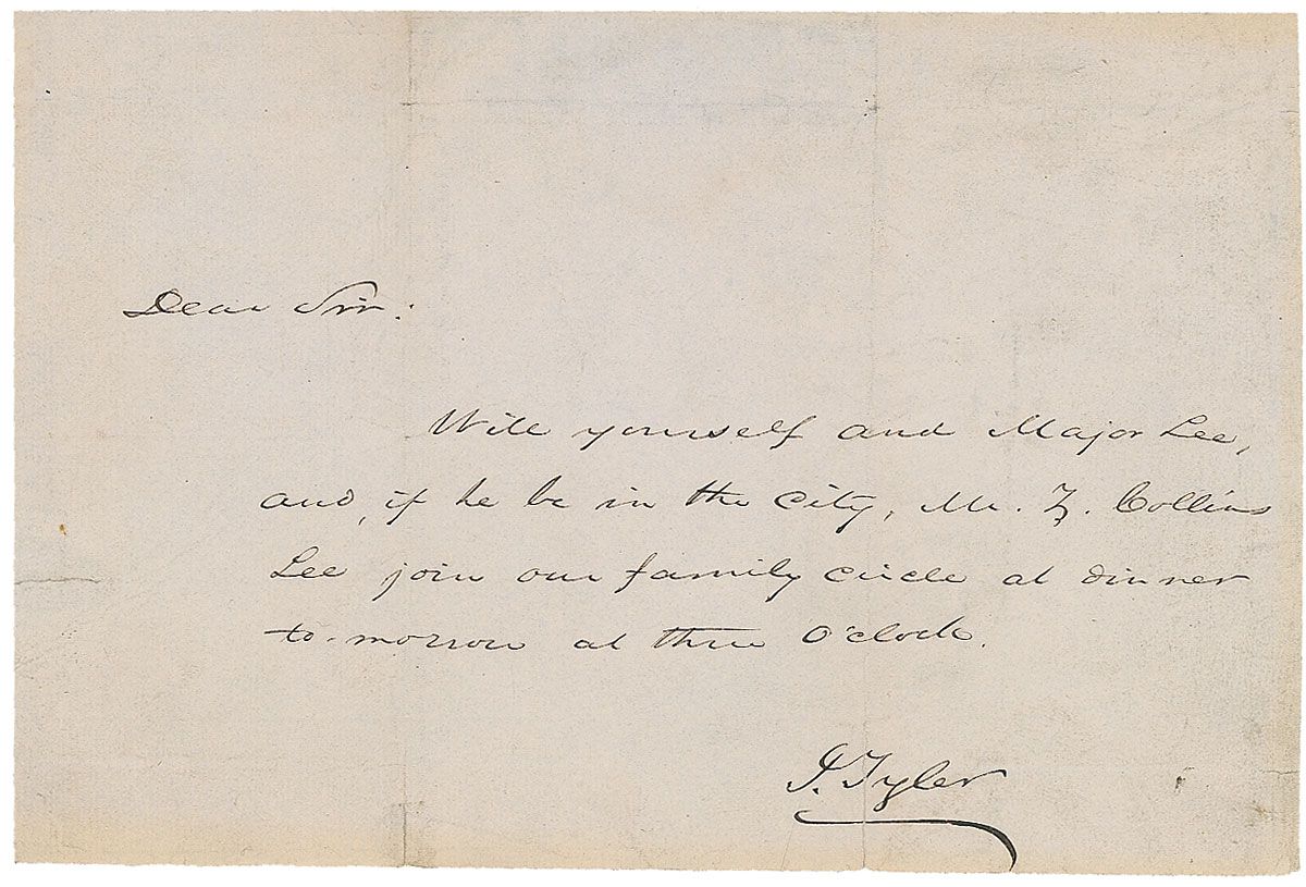LS, signed “J. Tyler,” one page, 7.5 x 5, no date. Tyler sends a dinner invitation. In full: “Will yourself and Major Lee, and if he be in the city, Mr. Z. Collins Lee join our family circle at dinner to-morrow at three o’clock.” In fine condition, with intersecting folds, a couple passing through signature.