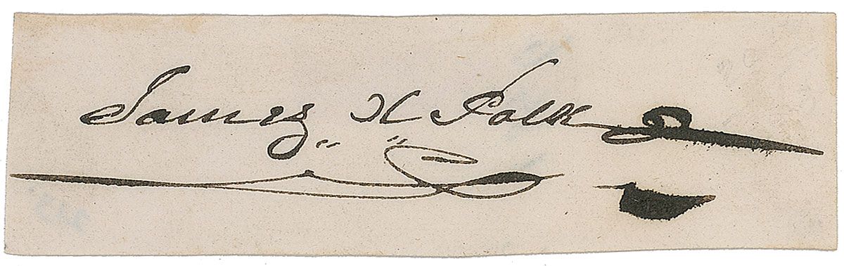Ink signature, “James K. Polk,” on an off-white 3 x 1 slip. In fine condition.