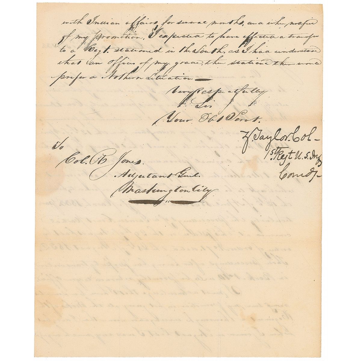 LS, signed “Z. Taylor, Col, 1st Regt, U. S. Infy, Comd.,” one page, both sides, 7.75 x 9.25, Fort Crawford, April 3, 1833. Letter to Colonel Jones. In part: “On a minute examination of the Books pertaining to the 1st Regt of Infantry, I find several of them have been irregularly kept for the past two years, particularly Court Martial Book No. 10 in which there hasn’t been entered the proceedings of a Court Martial of any description since the 12th of April 1821…I must acknowledge that I have been somewhat remiss since my promotion in not giving all the Books of the Regiment a thorough investigation sooner but when I joined in August last I was very much engaged with Indian affairs for several months.” In fine condition, with intersecting folds, and a few small areas of light toning.