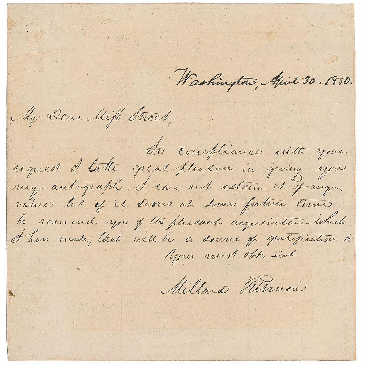 ALS, one page, 7.75 x 8, Washington, April 30, 1850. Fillmore responds to an autograph request. In full: “In compliance with your request I take great pleasure in giving you my autograph. I can not esteem it of any value but if it serves at some future time to remind you of the pleasant acquaintance which I have made, that will be a source of gratification.” Letter is affixed to an identical size sheet. Intersecting folds, one through a single letter of signature, a light block of toning over signature and portion of text, and a bit of light soiling, otherwise fine condition.