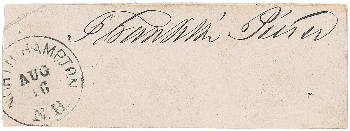 Bold franking signature, “Franklin Pierce,” on an off-white 4.5 x 2 clipped address panel, bearing an August 16, North Hampton, New Hampshire postmark. Slip is affixed to an identical size heavy stock sheet. In fine condition.