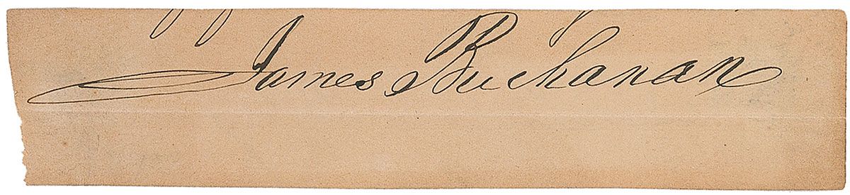 Ink signature, “James Buchanan,” on an off-white 5.25 x 1.25 slip clipped from a larger document or letter. A horizontal fold under signature, a few partial letters visible at top, and a uniform shade of toning, otherwise fine condition.