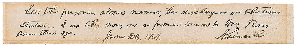 Handwritten war-dated endorsement, signed as president, “A. Lincoln,” on an off-white 8.25 x 1.25 lightly-lined slip, June 29, 1864. In full: “Let the prisoner above named, be discharged on the terms stated. I do this now, on a promise made to Mr. Ross some time ago.” In fine condition, with some scattered light soiling.