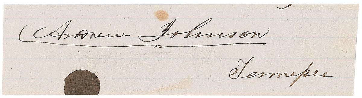Ink signature, “Andrew Johnson, Tennessee,” on an off-white 5 x 1.5 lightly-lined slip. In fine condition, with an ink spot to bottom (affecting nothing), and a small spot of toning to top edge.