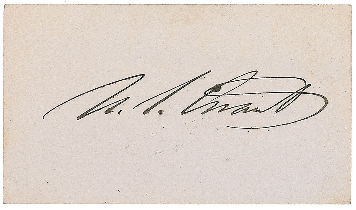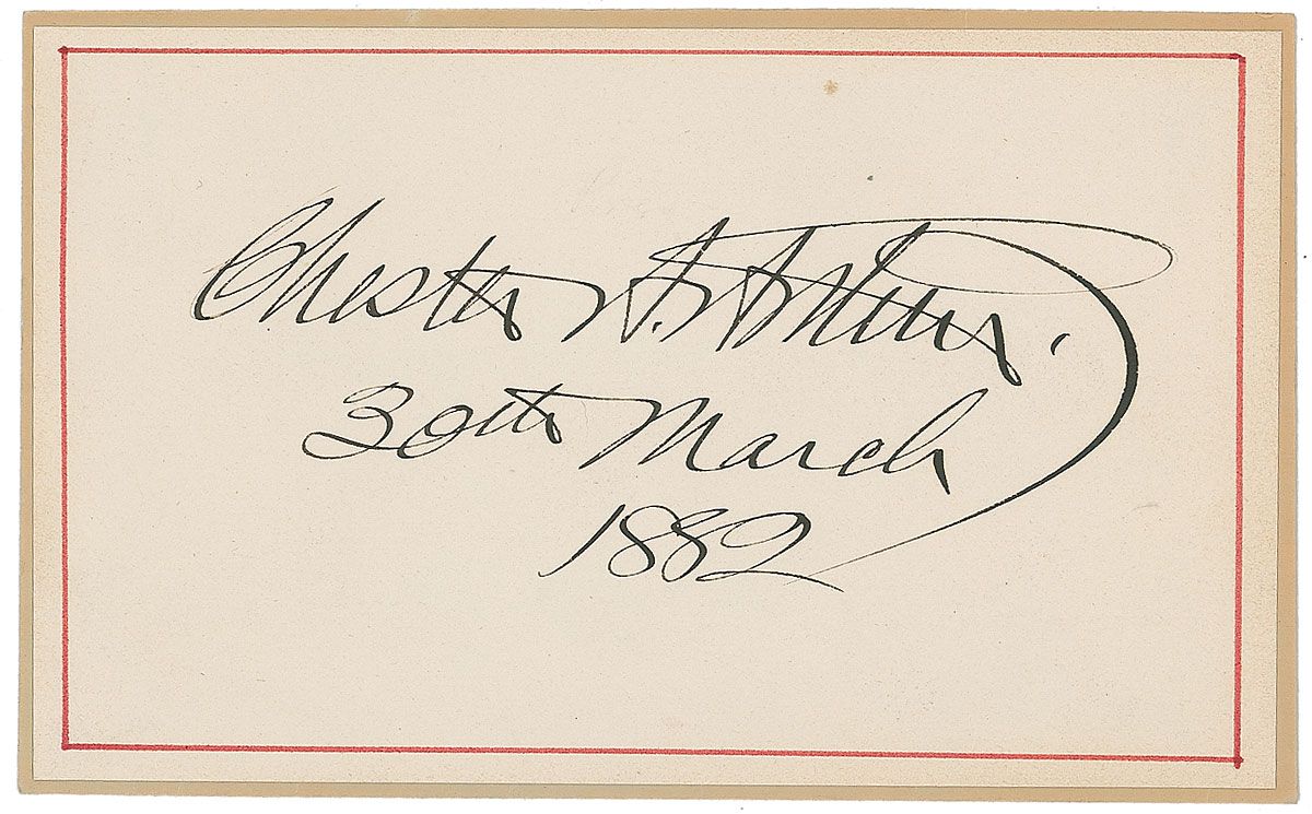 Huge ink signature, as president, “Chester A. Arthur, 30th March 1892,” on an off-white 6 x 3.5 sheet affixed to a slightly larger card. In fine condition.