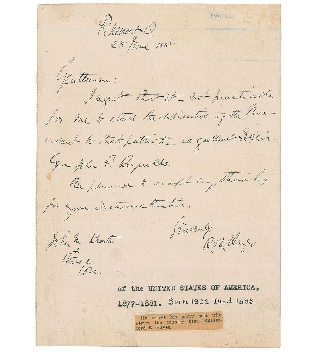 ALS, signed “R. B. Hayes,” one page, 5.5 x 7.5, Fremont, Ohio, June 28, 1886. Letter declining an invitation to a dedication. In full: “I regret that it is not practicable for me to attend the dedication of the monument to that patriotic and gallant Soldier Gen. John F. Reynolds. Be pleased to accept my thanks for your courteous attention.” Letter is affixed to an identical size sheet. In very good condition, with scattered light toning and soiling, typed and ink notations to bottom, as well as a small affixed caption, and a light stamp remnant to top.