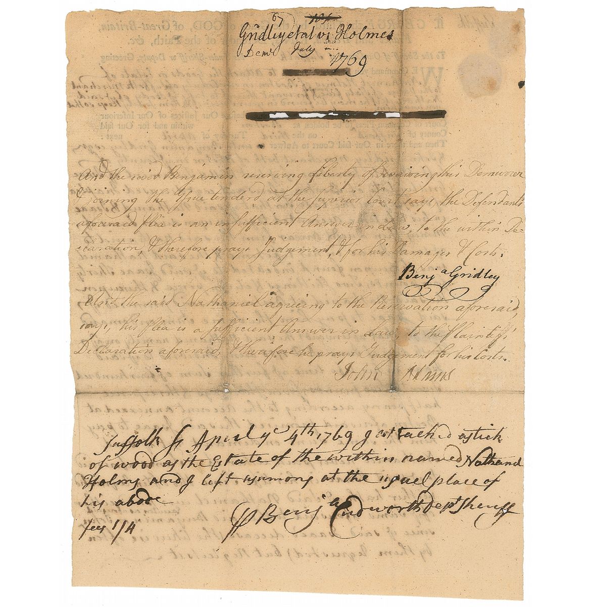 Endorsement, signed “John Adams,” on the reverse of a partly-printed document, 7.25 x 9.5, one page, both sides, dated July 1769, concerning the matter of Gridley et al v. Holmes, praying for judgement on behalf of the plaintiff, pleading the defendant’s answer to complaint is insufficient in law. Endorsement reads, in part: “And the said Nathaniel agreeing to the Reservation aforesaid…his plea is a sufficient answer in law.” Signed at the conclusion by Adams. In very good condition, with some mild toning, soiling, and pinholes to intersecting folds, a few small areas of ink erosion (none to endorsement or signature), and a few stray ink marks. Front of the document retains most of its red wax seal.