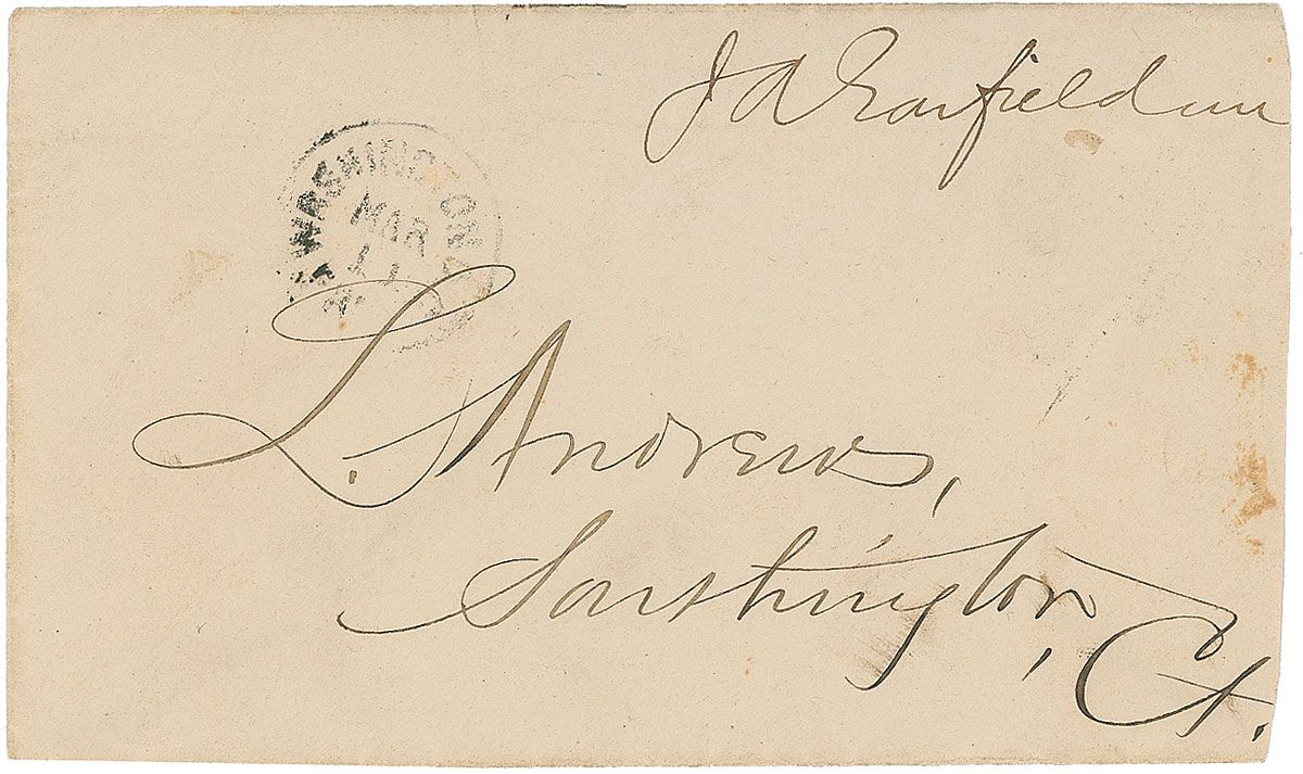 Franking signature, “J. A. Garfield mc,” on a 5.5 x 3.5 mailing envelope, addressed in another hand to “L. Andrews, Southington, Ct.” Envelope also bears a March 11, Washington, D. C., postmark. In fine condition.