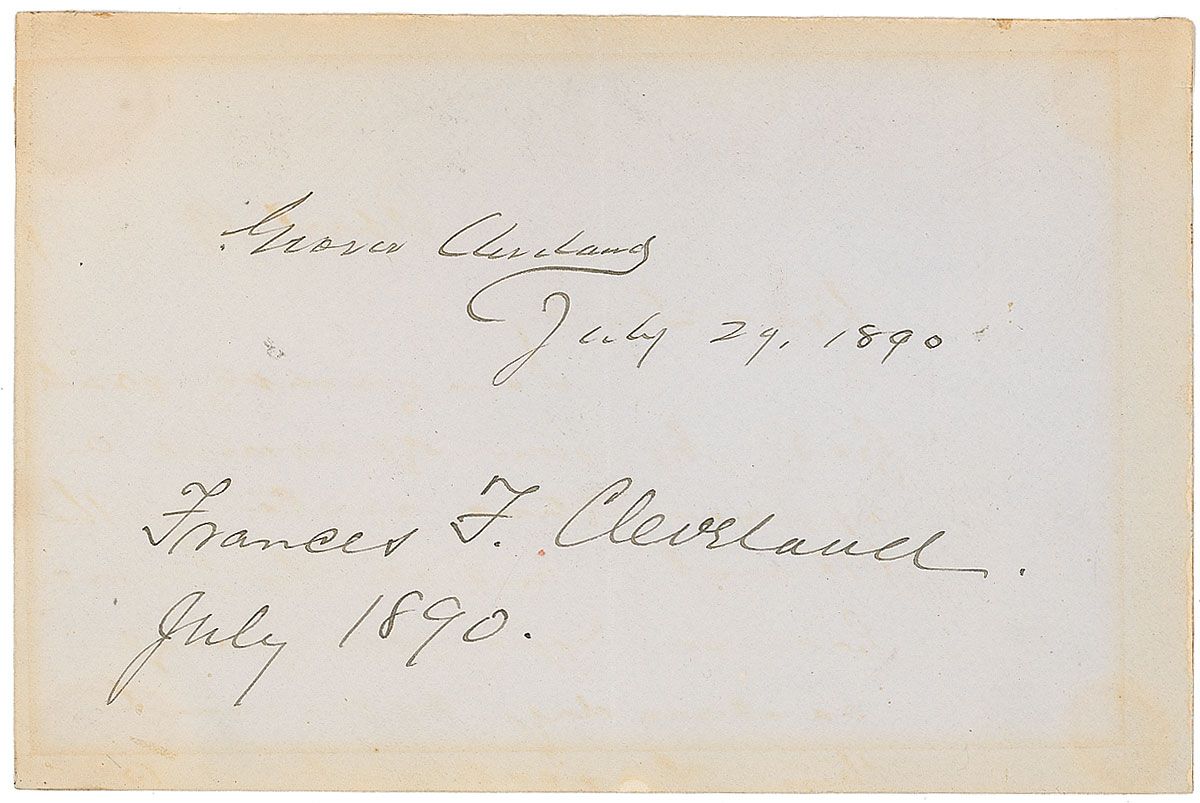 Ink signature, “Grover Cleveland, July 29, 1890,” and “Frances F. Cleveland, July 1890,” on an off-white 5.75 x 3.75 sheet. In fine condition, with some mild toning.