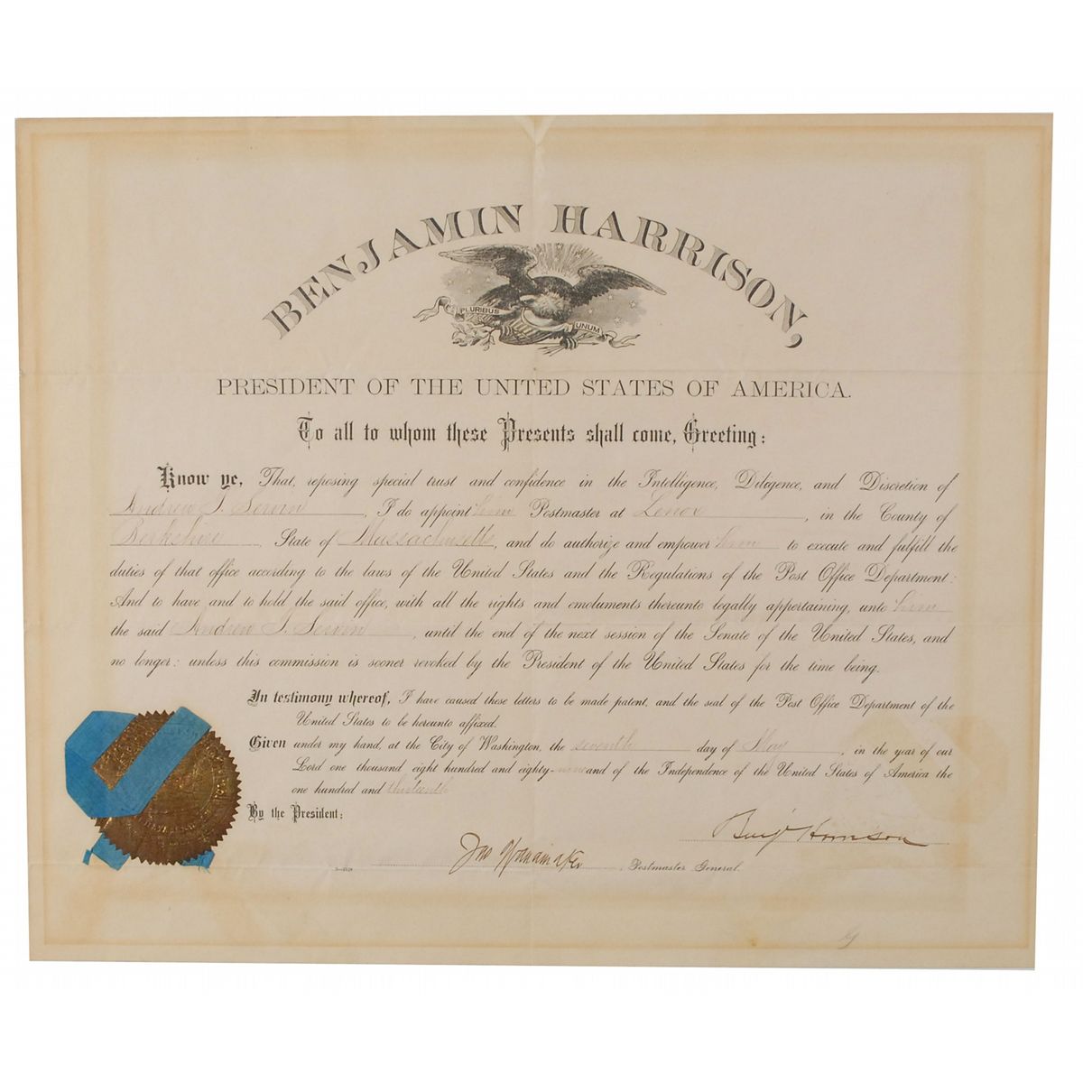 Partly-printed DS, as president, “Benj. Harrison,” one page, 16.75 x 14, May 7, 1889. President Harrison appoints Andrew J. Servin Postmaster of Lenox, Massachusetts. Signed at the conclusion by Harrison and countersigned by Postmaster General John Wanamaker. Central horizontal and vertical folds, a uniform shade of mild toning, and some mirroring of seal over end of signature, otherwise fine condition. The gold foil seal is tarnished, but intact, and retains its original ribbon.