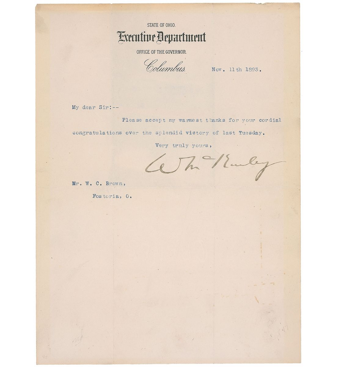 TLS, signed “W. McKinley,” one page, 7.75 x 10.75, State of Ohio Executive Department letterhead, November 11, 1893. Governor McKinley sends a brief letter of thanks. In full: “Please accept my warmest thanks for your cordial congratulations over the splendid victory of last Tuesday.” In fine condition, with intersecting folds, one through a single letter of signature, and a bit of light soiling to lower right.