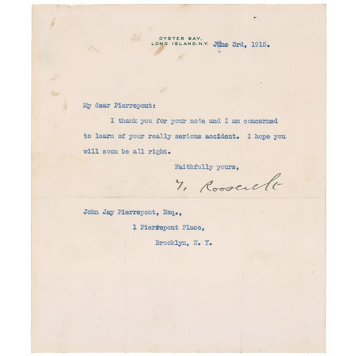 TLS, signed “T. Roosevelt,” one page, 6.25 x 7.5, Oyster Bay letterhead, June 3, 1915. Short letter to John Jay Pierrepont. In full: “I thank you for your note and I am concerned to learn of your really serious accident. I hope you will soon be all right.” In very good to fine condition, with intersecting folds, one through a single letter of signature, mounting remnants to reverse top edge, and some scattered small stains to top left.