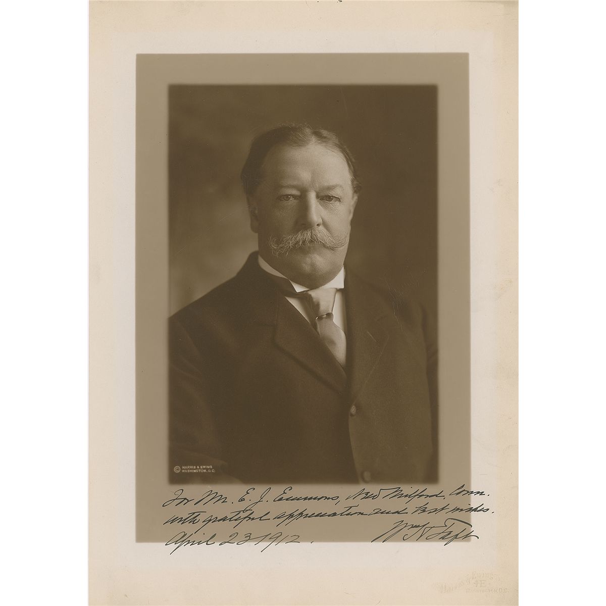 Vintage matte-finish 9.5 x 13.25 Harris and Ewing portrait of Taft, signed and inscribed in the lower border in fountain pen, as president, “For Mr. E. J. Emmons, New Milford, Conn., with grateful appreciation and best wishes, Wm. H. Taft, April 23, 1912.” In fine, clean condition, with a couple trivial creases to right side.