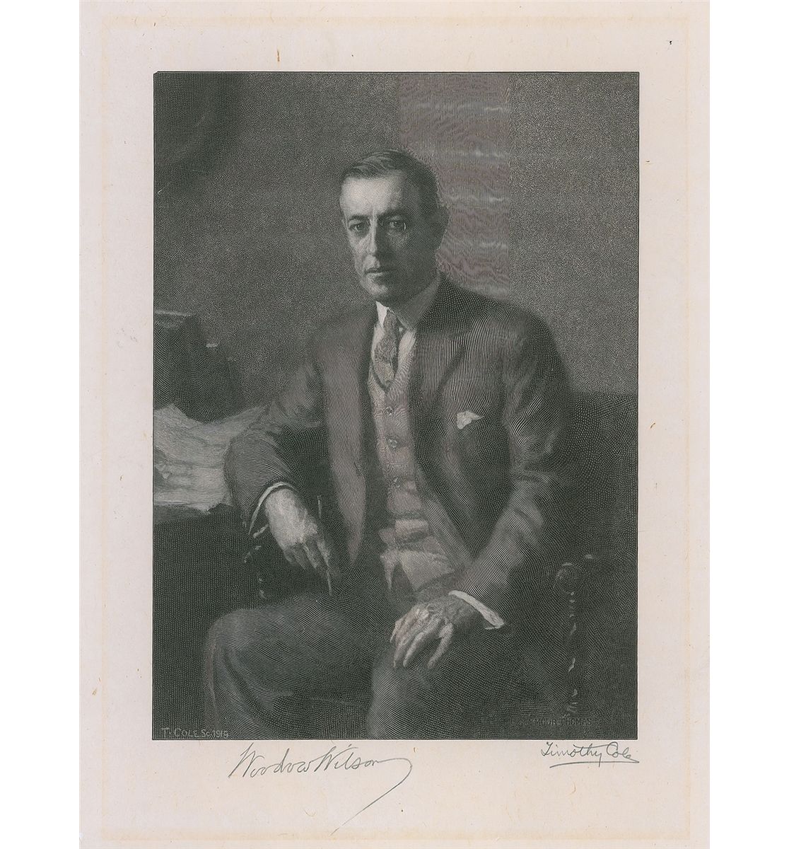 Vintage 1919 steel engraving of Wilson by Timothy Cole, 9.75 x 13.25, signed in the lower border in pencil by Wilson, and also signed in pencil by Cole. In fine condition.