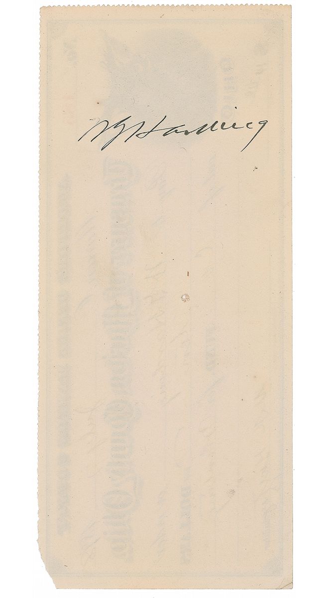 Endorsed Auditor’s Office Marion County Ohio Treasurer’s check, 7.75 x 3.25, filled out and signed in another hand, payable to Harding for $10.00, dated July 7, 1898, “for printing,” endorsed on the reverse, “W. G. Harding.” In fine condition, with a small pinhole to center of check.