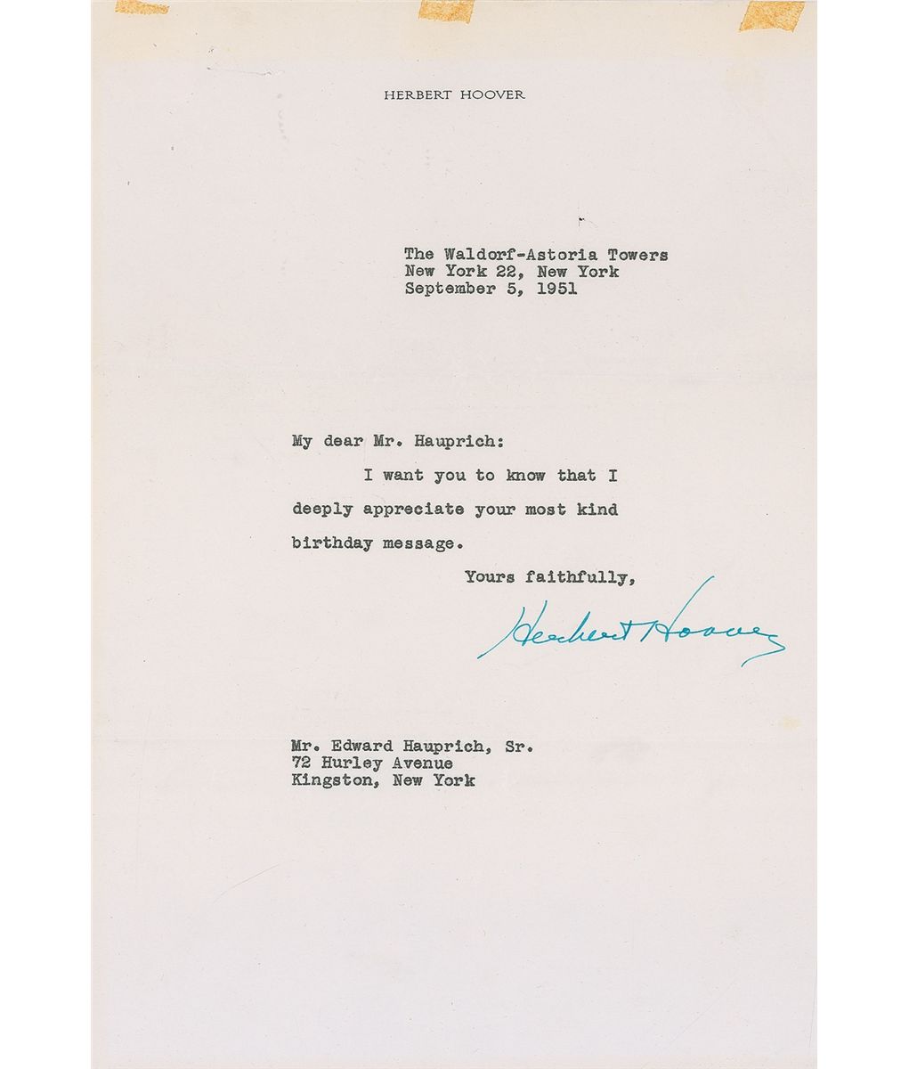 TLS, one page, 7.25 x 10.5, personal letterhead, September 5, 1951. Brief letter of thanks for sent birthday wishes. In full: “I want you to know that I deeply appreciate your most kind birthday message.” In fine condition, with some tape toning along top edge.