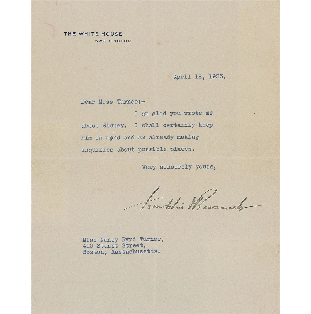 TLS, as president, one page, 7 x 9, White House letterhead, April 18, 1933. Letter to Nancy Byrd Turner. In full: “I am glad you wrote me about Sidney. I shall certainly keep him in mind and am already making inquiries about possible places.” In fine condition, with central horizontal and vertical folds, one through a single letter of signature, and a few trivial spots.