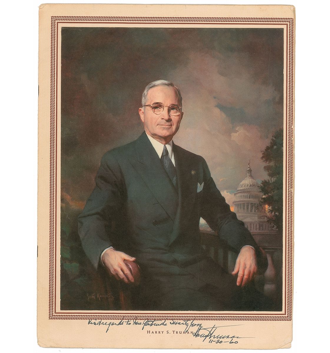 Vintage color print of Truman’s official presidential portrait, 9.5 x 13, signed and inscribed in the lower border in black ink, “Kind regards to Mrs. Gertrude Swartz from Harry S. Truman 11-30-60.” In fine condition, with some light corner tip creases.