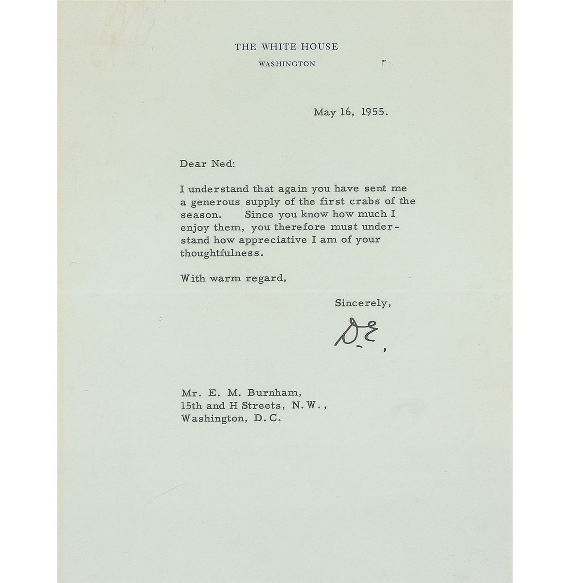 TLS, as president, signed “D. E.,” one page, 6.75 x 8.75, White House letterhead, May 16, 1955. Letter of thanks to E. M. Burnham. In full: “I understand that again you have sent me a generous supply of the first crabs of the season. Since you know how much I enjoy them, you therefore must understand how appreciative I am of your thoughtfulness.” In fine condition, with a couple of light paperclip marks to top edge and mounting remnants to reverse top edge. Accompanied by the original mailing envelope.