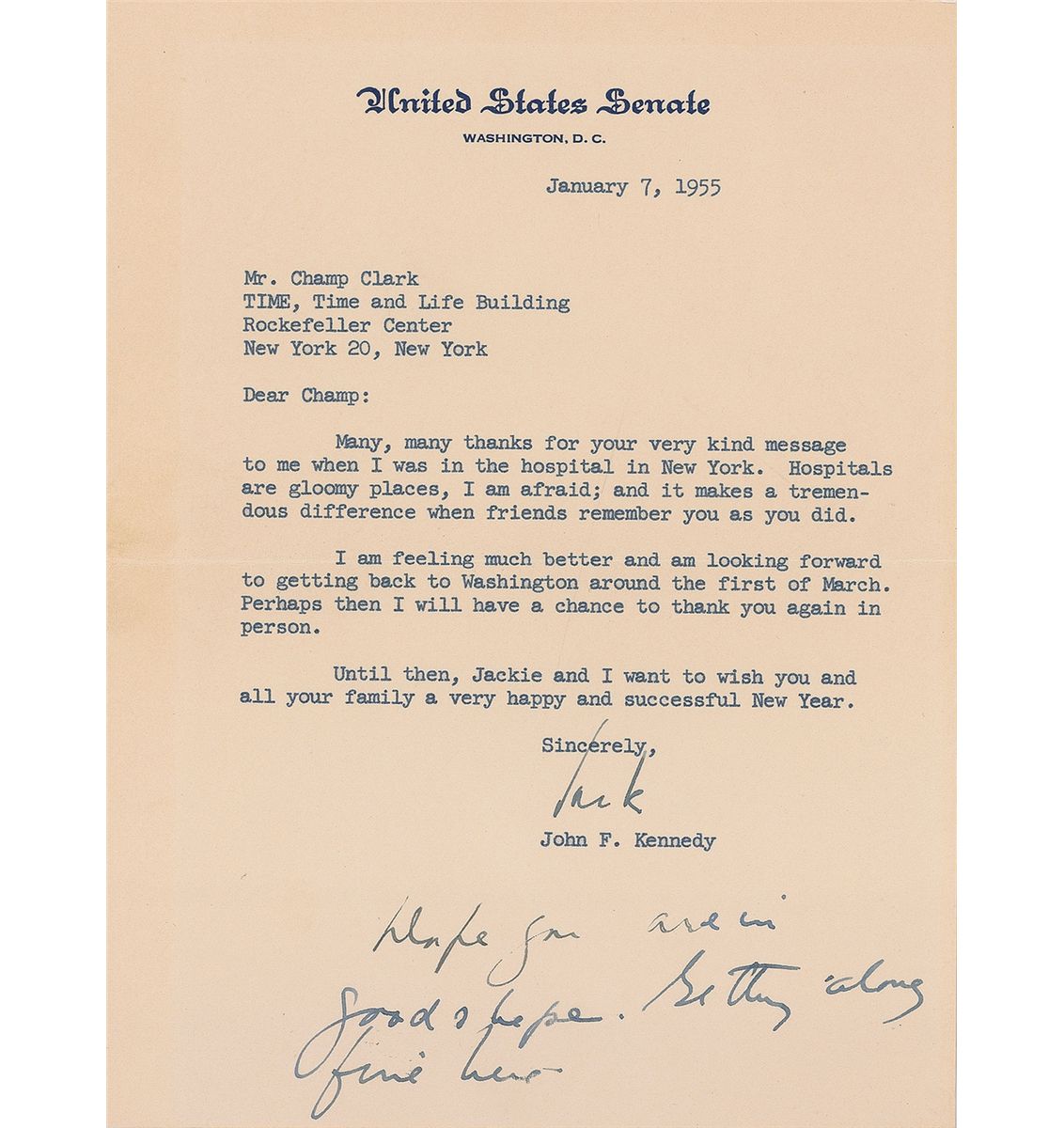 TLS, signed “Jack,” one page, 6 x 8, United States Senate letterhead, January 7, 1955. Letter to Champ Clark at Time. In part: “Many, many thanks for your very kind message to me when I was in the hospital in New York. Hospitals are gloomy places, I am afraid; and it makes a tremendous difference when friends remember you as you did. I am feeling much better and looking forward to getting back to Washington around the first of March. Perhaps then I will have a chance to thank you again in person.” At the bottom, Kennedy adds a short handwritten postscript, “Hope you are in good shape. Getting along fine here.” In fine condition, with a subtle shade of uniform toning.